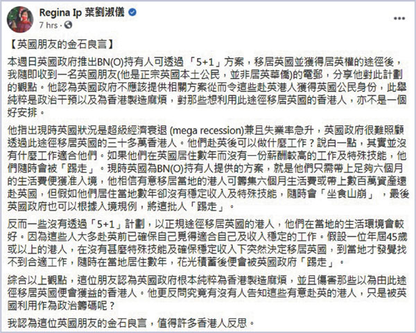 叶刘淑仪在帖中说,英国推出BNO持有人通过"5+1"获得居英权的途径后,她随即收到一名正宗英国本土公民朋友的电邮,分享其对此计划的观点。