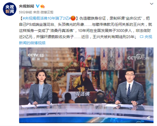 星岛环球网消息:据央视报道,伪造藏族身份证,录制所谓“坐床仪式”,把自己PS成端坐莲花台、头顶佛光的形象……与藏传佛教无任何关系的王兴夫,就这样摇身一变成了“洛桑丹真活佛”,10年间在全国发展弟子3000多人,非法敛财近2亿元,并强奸猥亵数名女弟子……近日,王兴夫被判有期徒刑25年。