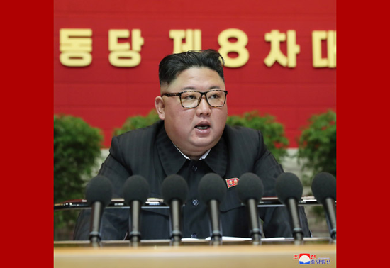 朝鲜最高领导人金正恩1月9日在朝鲜劳动党第八次全国代表大会上做总结报告 图源:朝中社