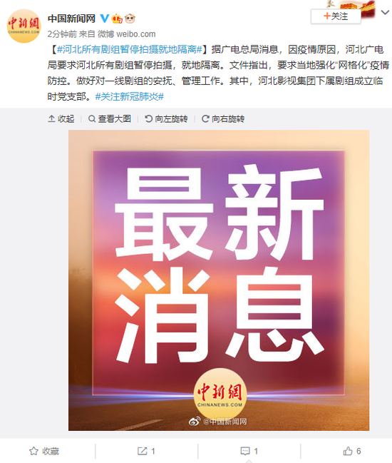 据广电总局消息,因疫情原因,河北广电局要求河北所有剧组暂停拍摄,就地隔离。文件指出,要求当地强化“网格化”疫情防控。做好对一线剧组的安抚、管理工作。其中,河北影视集团下属剧组成立临时党支部。