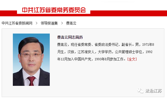 1月18日晋升中共江苏省委常委的费高云,已明确担任中共江苏省委常委、省委政法委书记,副省长。
