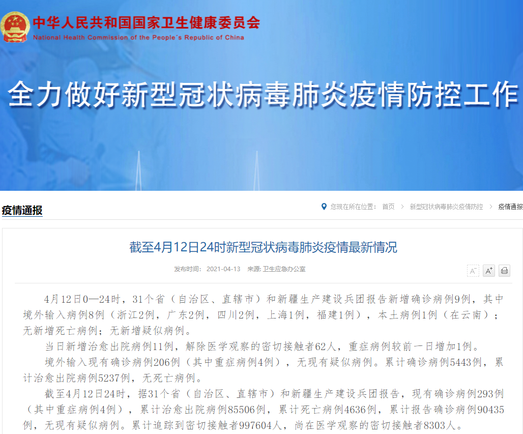 截至4月12日24时,据31个省(自治区、直辖市)和新疆生产建设兵团报告,现有确诊病例293例(其中重症病例4例),累计治愈出院病例85506例,累计死亡病例4636例,累计报告确诊病例90435例,无现有疑似病例。累计追踪到密切接触者997604人,尚在医学观察的密切接触者8303人。