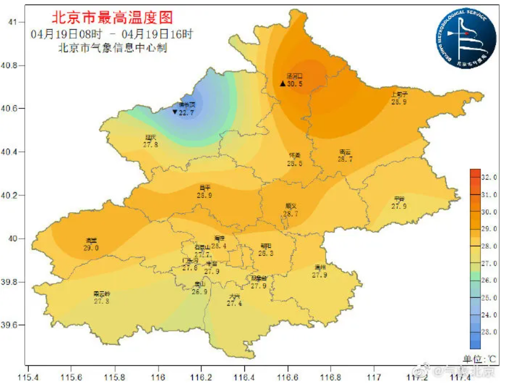 北京市气象台消息,4月19日南郊观象台最高气温为27.9℃,出现在14时45分,突破了此前2月21日的最高气温25.6℃,创下了今年以来的气温新高,16时气温下降至27℃。