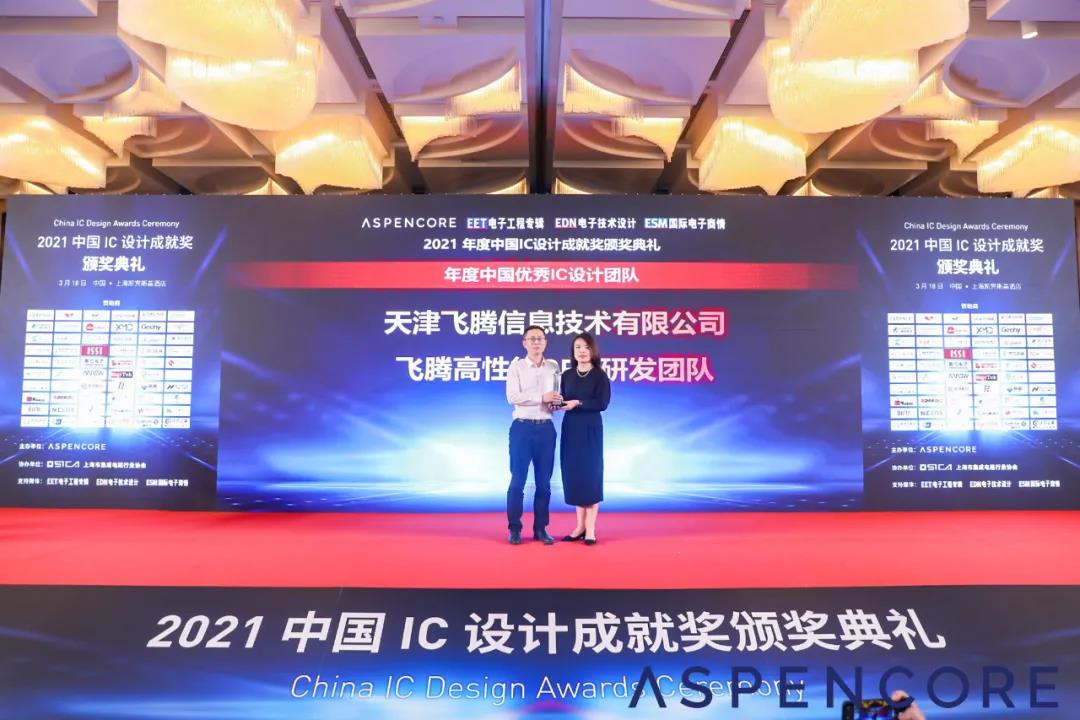3月18日,由全球电子技术领域领先的媒体集团ASPENCORE举办的“2021年中国IC领袖峰会暨中国IC设计成就奖颁奖典礼”在上海凯宾斯基酒店隆重举行。会上,飞腾公司高性能CPU研发团队凭借卓著的贡献和极具开创意义的研发成果荣获“年度中国优秀IC设计团队”。