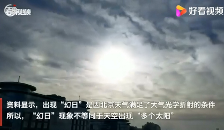 资料显示,出现“幻日”是因北京天气满足了大气光学折射的条件。所以,“幻日”现象不等同于天空出现“多个太阳”。