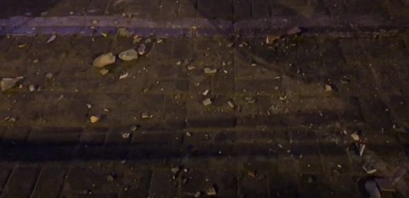 澎湃新闻记者在当晚现场看到,天申综合大楼就在马路边上,现场自天申综合小区南门到茅台路威宁路路口,拉起了约5米宽、20余米长的警戒线,掉落的碎片已被扫到马路边沿,有4名保安值守当场。