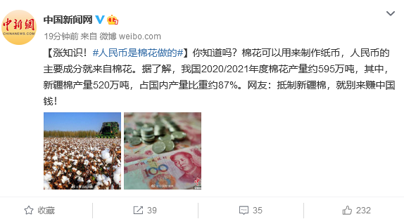 你知道吗?棉花可以用来制作纸币,人民币的主要成分就来自棉花。据了解,我国2020/2021年度棉花产量约595万吨,其中,新疆棉产量520万吨,占国内产量比重约87%。网友:抵制新疆棉,就别来赚中国钱!