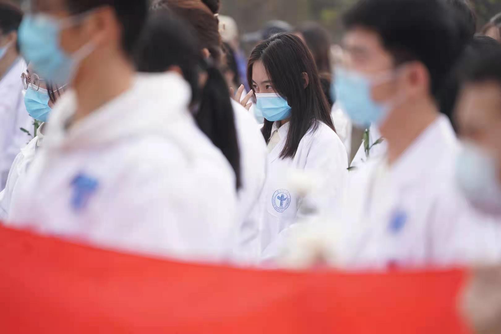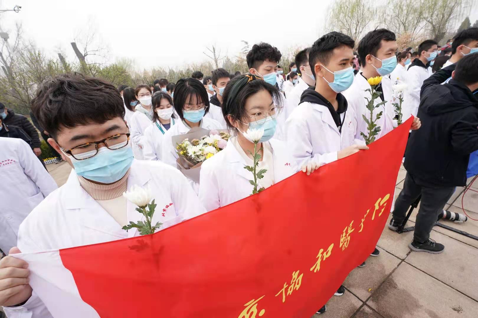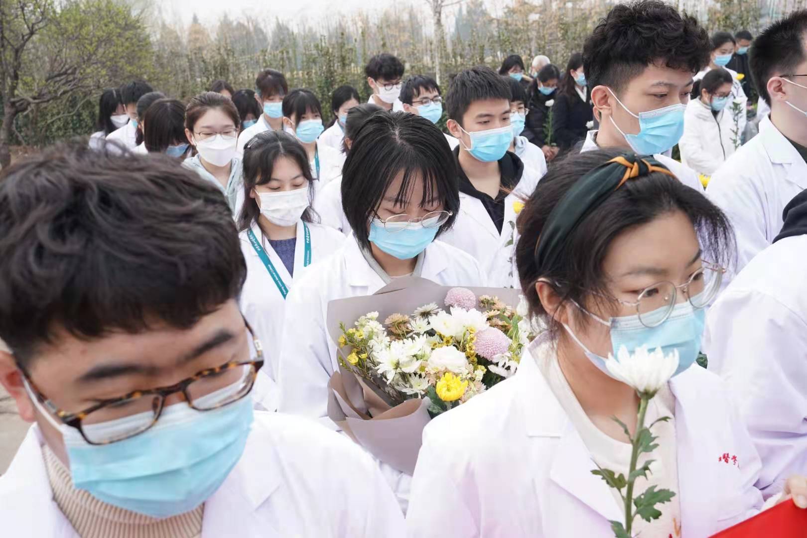 生命纪念碑前,北京协和医学院、北京大学医学部、首都医科大学师生和北京市红十字会志愿者、捐献者家属代表等150余人手捧寄托无限哀思的黄色、白色菊花,神情凝重,面向纪念碑,肃立、默哀。