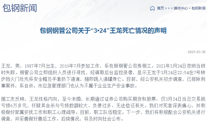 据包钢集团官网消息,30日,包钢钢管公司发布关于“3•24”王龙死亡情况的声明,以下为全文: