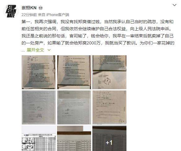 第一,我再次强调,我没有找郑爽借过钱,当然我承认自己当时的疏忽,没有和前任签相关的合同,但我依然会继续维护自己合法权益,向上级人民法院申诉。我还是之前说的那句话,官司输了,钱会给你,我早在一审结束后就卖掉了自己的一处房产,如果输了就会给郑爽2000万,我就当买了教训。为你们一家花掉的钱,我也算为自己的感情和无知买了单;我会把从2018年4月18日开始发生的所有事情,带上证据,一一整理出来,带上你们想听的完整录音,放出来。让所有人了解这一切的真相!