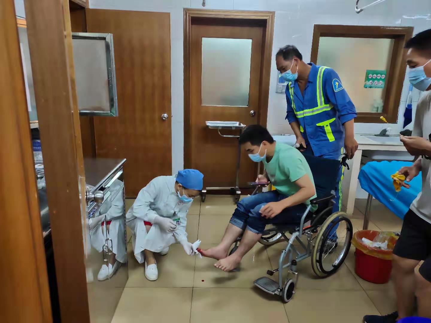 “大概9点20分,我从河岸一路巡查到游艇会码头,看到游艇船员脚趾头哗哗流血。”陈少军告诉小e,前往查看伤情时,发现船员的脚趾头被夹断,流血不止。据陈少军口述,当时事发突然,他马上呼叫正在附近进行保洁工作的同事何成忠寻求帮助。随后两人合力将伤者扶上环卫电瓶车,送往辖内的省工人医院进行治疗。因暂时地离开了工作岗位,在护送完伤者后,陈少军及时向上级说明报备了事件情况。