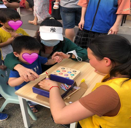 在愉快的氛围中,各位星星的孩子们和家人在康复中心老师的指导下一起参与到活动的游戏环节。活动现场设置了8个亲子游戏,孩子们每完成一项游戏,就能顺利得到一个“小印章”。游戏中,孩子们玩得又高兴又尽兴,脸上绽放着幸福的笑容。