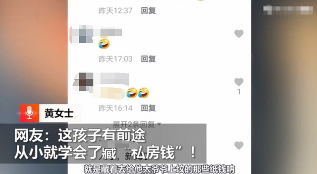 4月4日,福建泉州,清明节黄女士带着孩子去给逝去的亲人上坟,回来的时候在电梯里发现孩子的衣服里鼓鼓的,有些奇怪,到家里后就让孩子把衣服掀开看看里面是什么,没想到孩子把去上坟时用的冥币偷偷的藏了一些在衣服里,这让黄女士哭笑不得!网友:这孩子有前途,从小就学会了藏“私房钱”!
