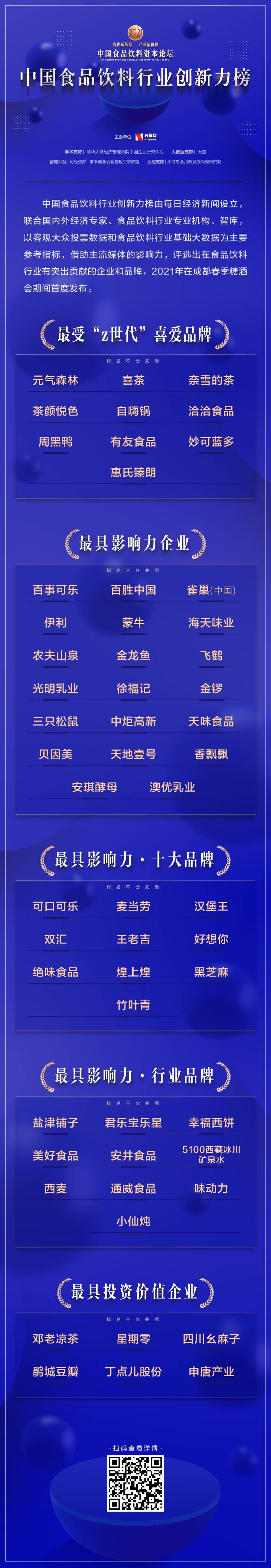 本次创新力榜也评选出“最受‘Z世代'喜爱品牌”,包括元气森林、喜茶、茶颜悦色等新式茶饮品牌,也包括洽洽食品等老牌国货品牌。它们是新消费场景的产物,同时也为食品饮料行业带来了创新的力量。